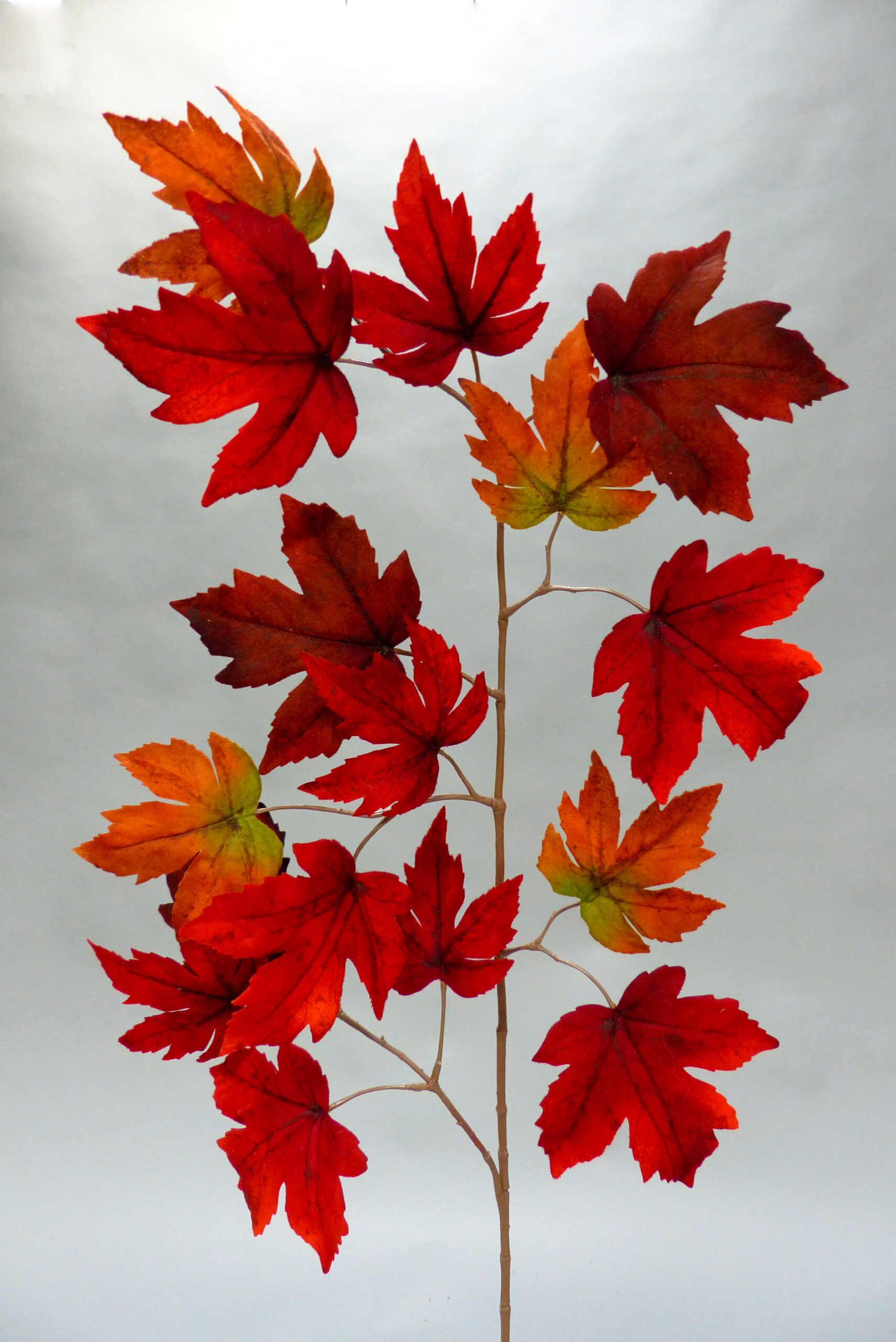 Künstlicher Ahornzweig in kräftigen Herbstfarben – in Rot und Orange erhältlich. Atmosphärisch für herbstliche Event-Dekoration.