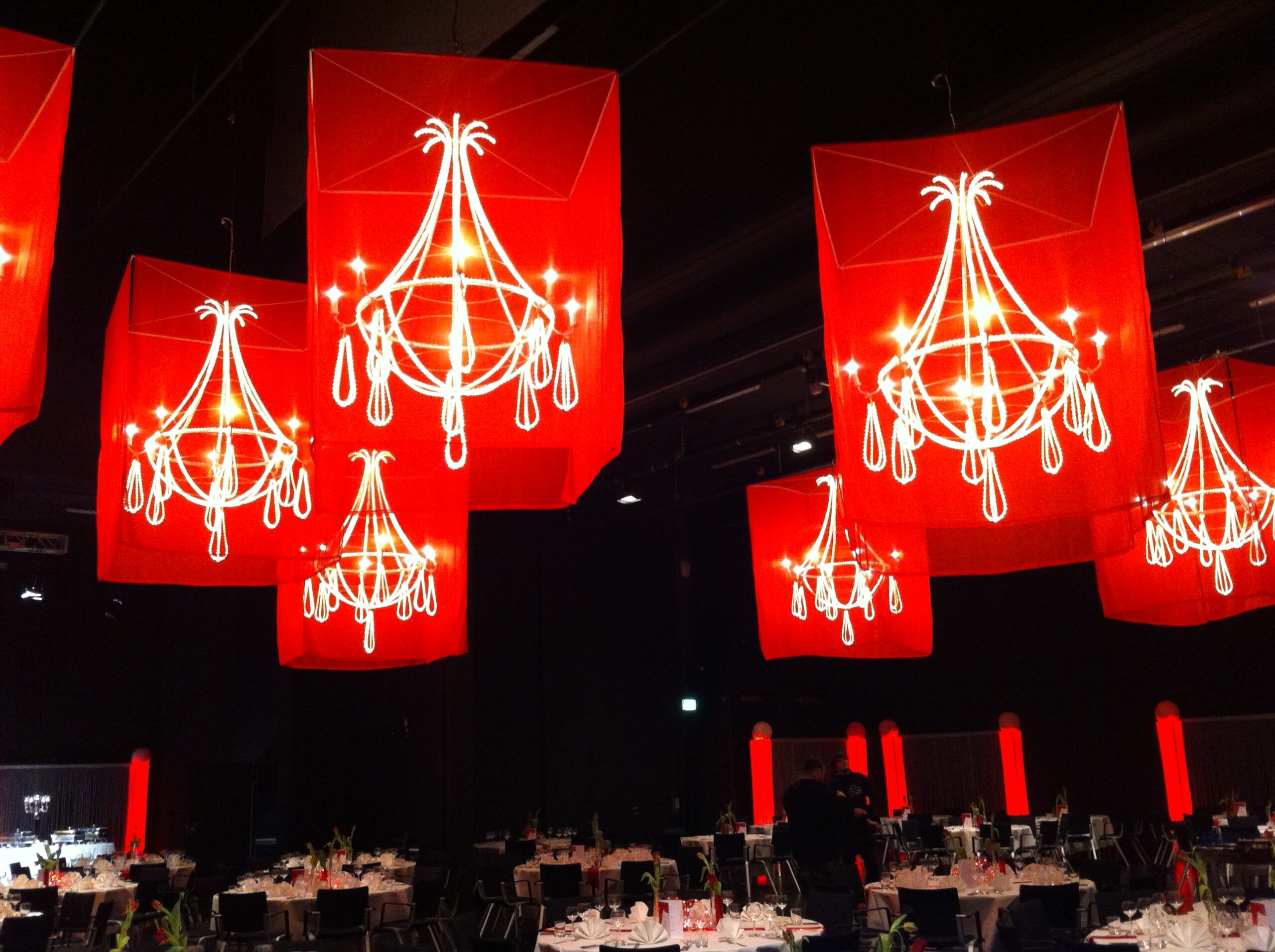 Eleganter Deckenleuchter mit durchscheinender Stoffummantelung. Maße: L 2 m × B 2 m × H 2 m