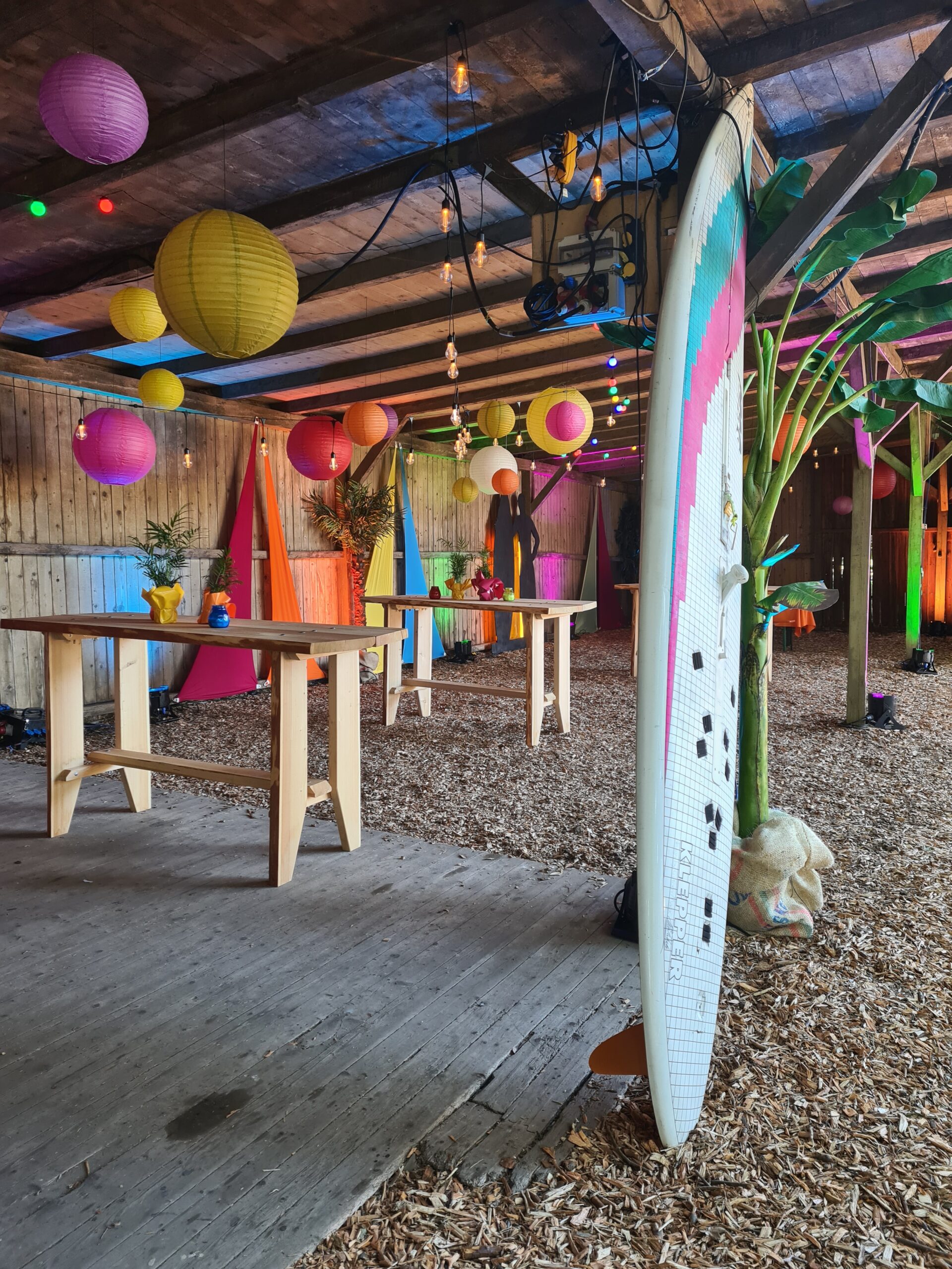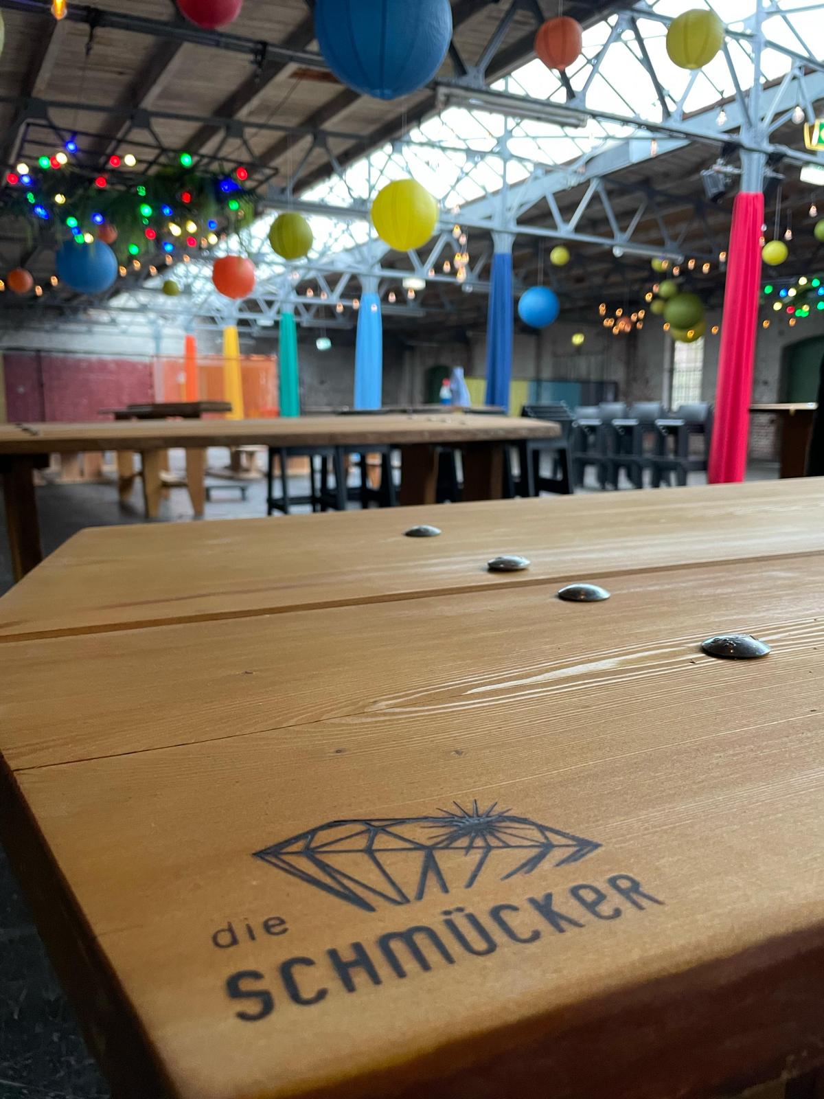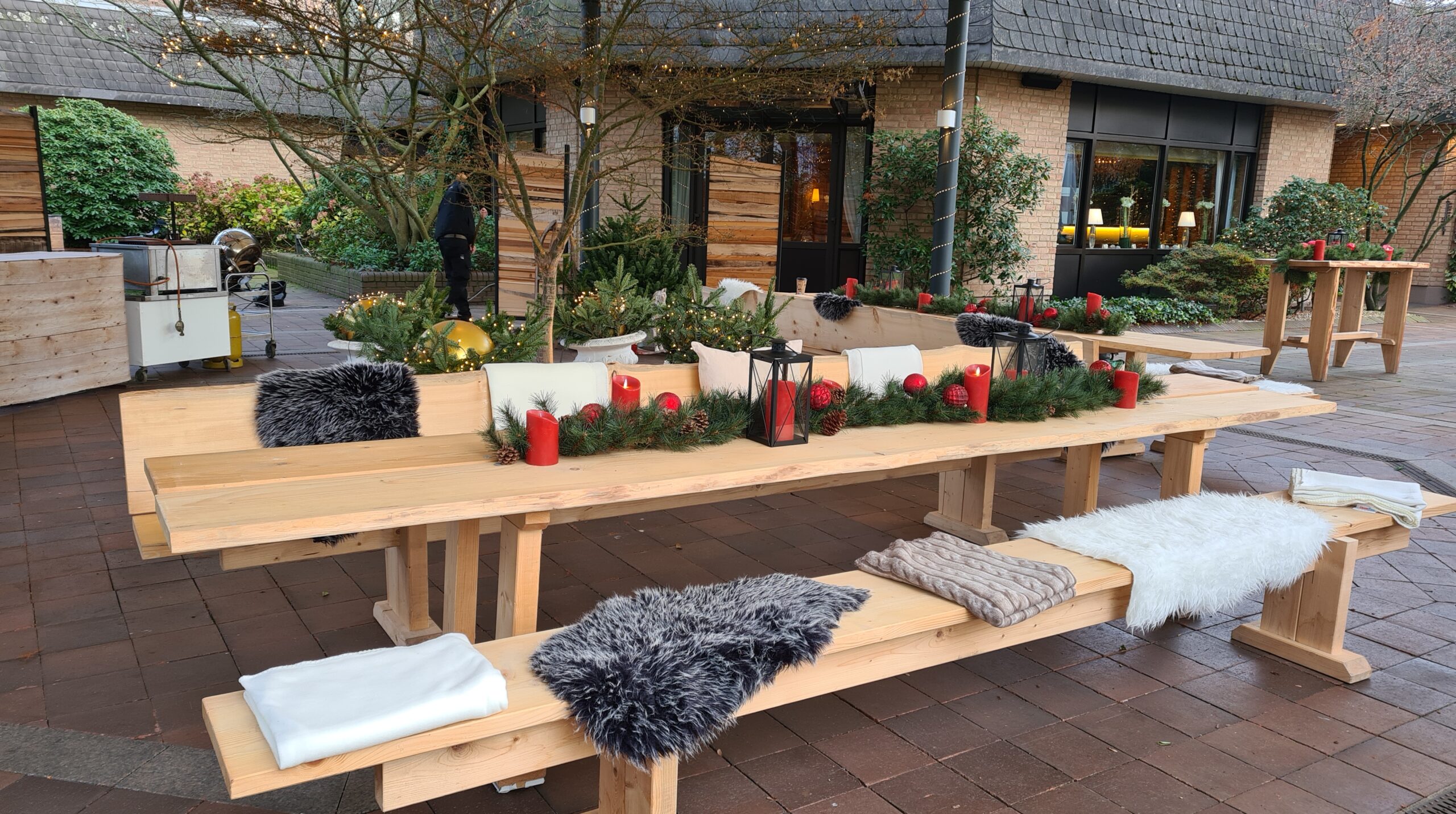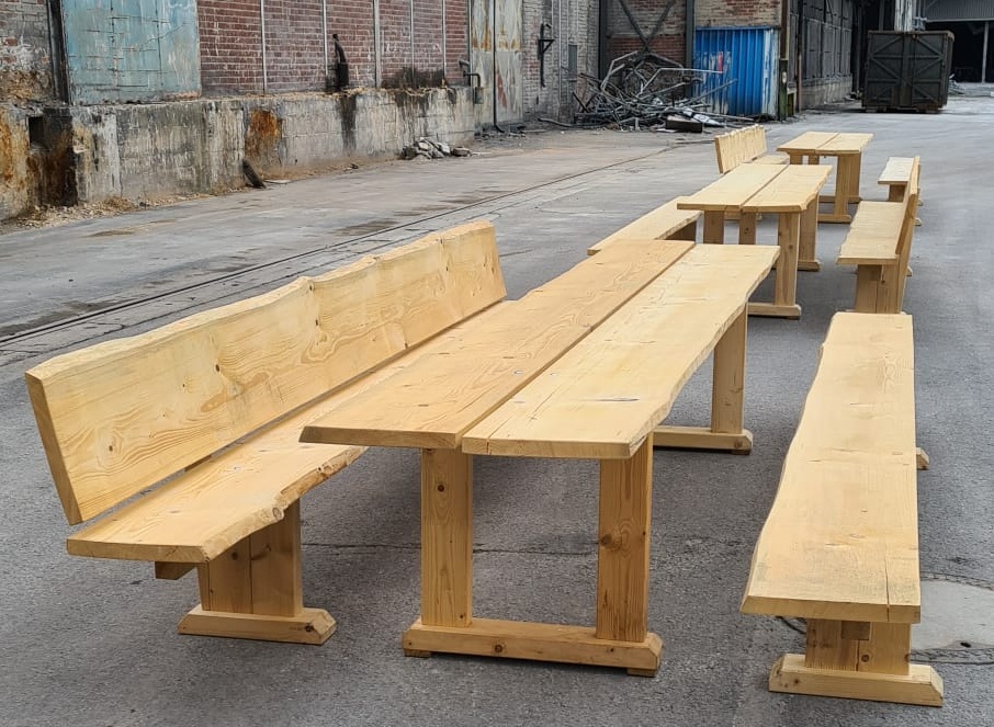 Rustikale Echtholz-Sitzgruppe mit 4 m Länge – perfekt für bis zu 16 Personen. Alternativ auch als Stehtisch in 2 m oder 4 m verfügbar.