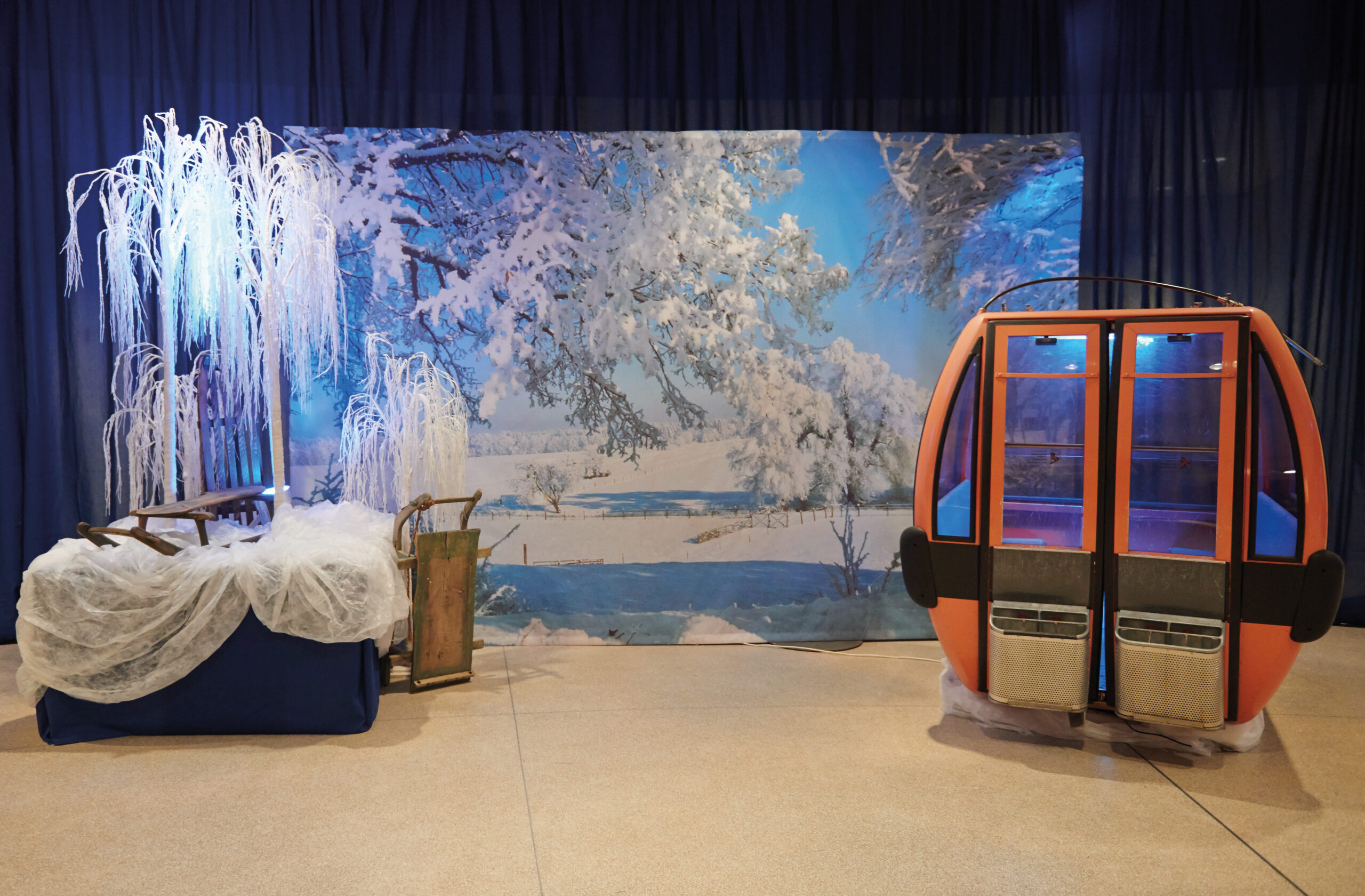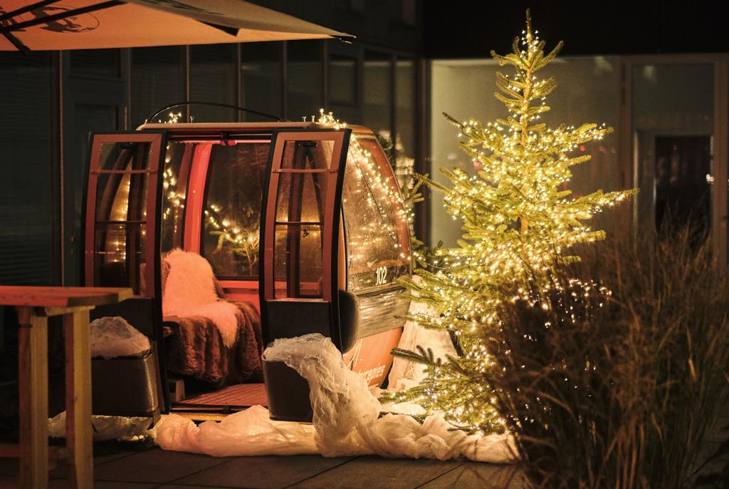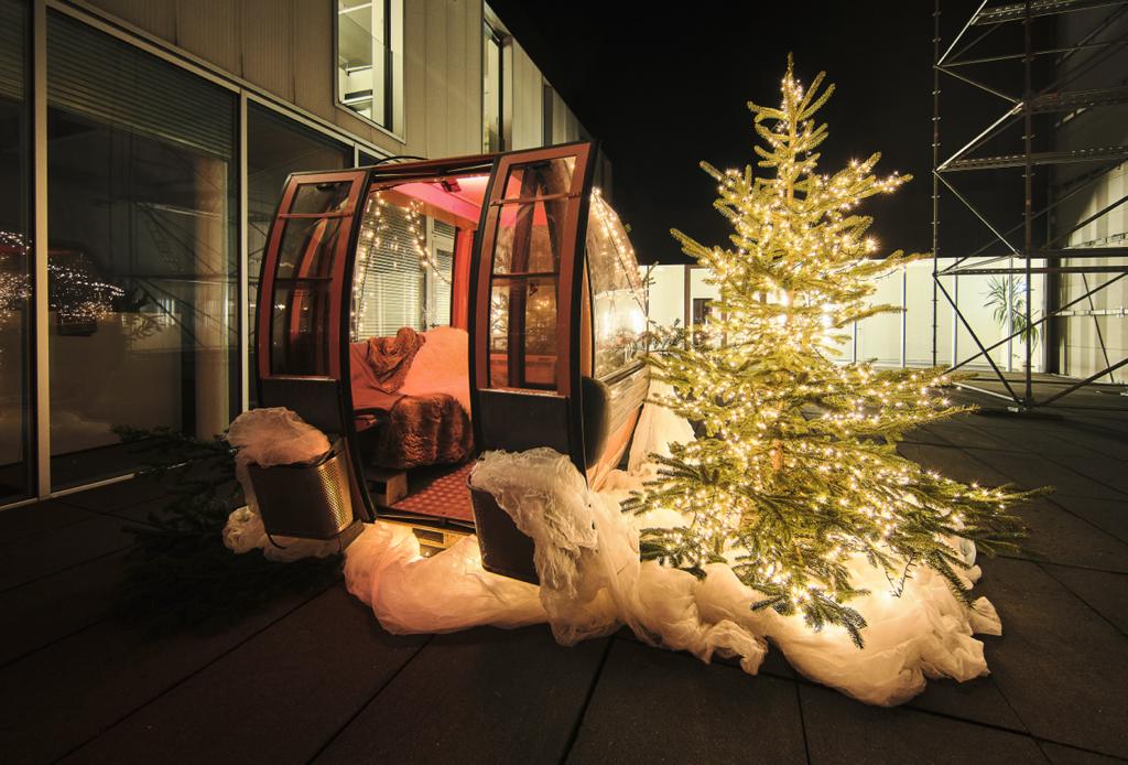 Originale Skigondel im alpinen Winterstil. Für das authentische Schneeurlaub- und Après-Ski-Ambiente