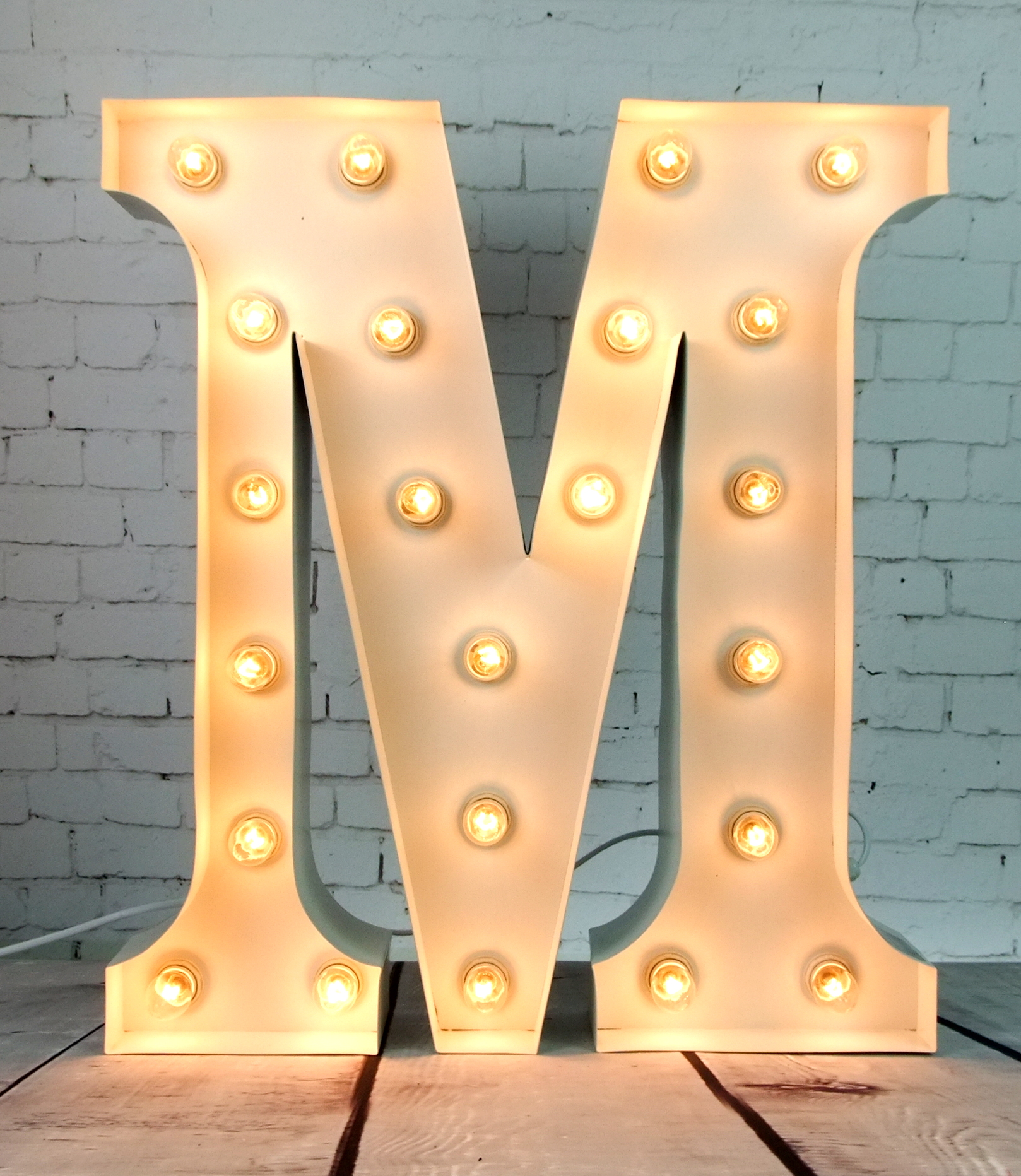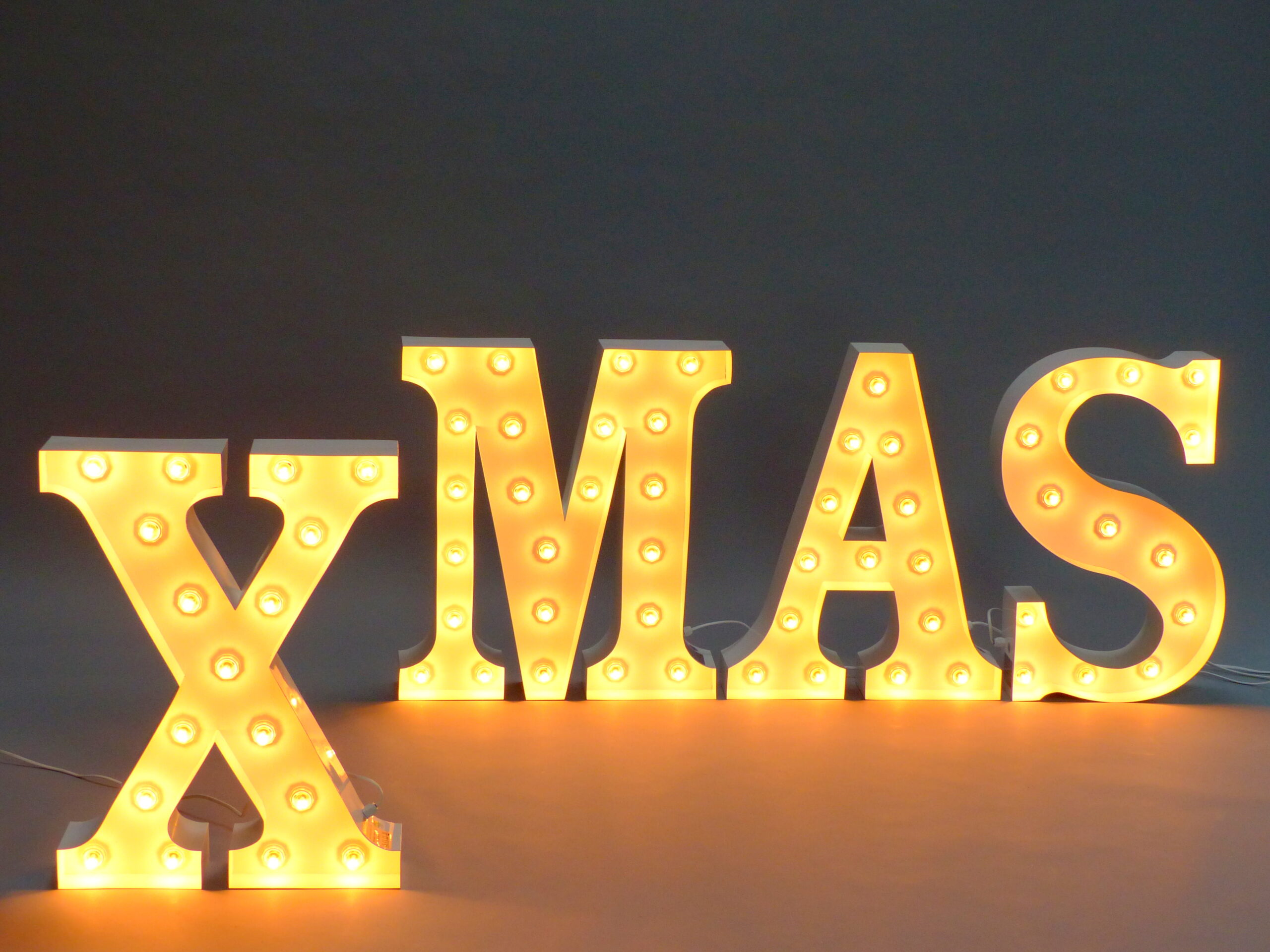 Weißes "X MAS" beleuchtet durch viele einzelne Birnen